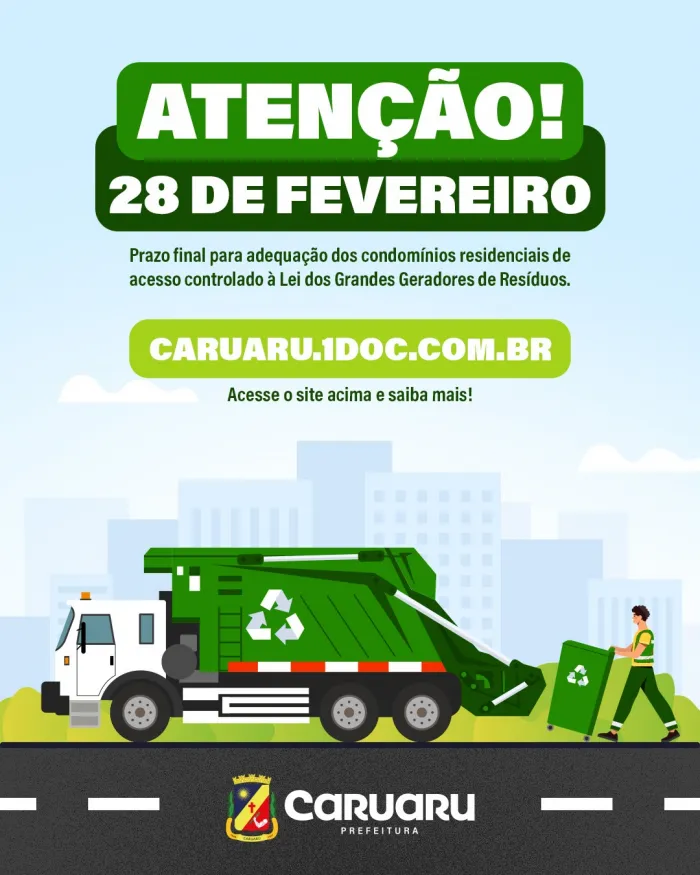 A Prefeitura de Caruaru informa que os condomínios residenciais com entrada controlada devem se adequar à Lei dos Grandes Geradores de Resíduos até o dia 28 de fevereiro. Para isso, é necessário realizar o cadastro obrigatório na plataforma 1Doc, acessível pelo link https://caruaru.1doc.com.br/. O processo exige que os responsáveis preencham um formulário e anexem documentos essenciais, como CNPJ, CPF do representante legal, alvará de funcionamento e, quando aplicável, as licenças ambientais. Além disso, é necessário declarar a quantidade de resíduos gerados mensalmente e apresentar o contrato com a empresa encarregada da coleta, transporte e destinação final dos resíduos.