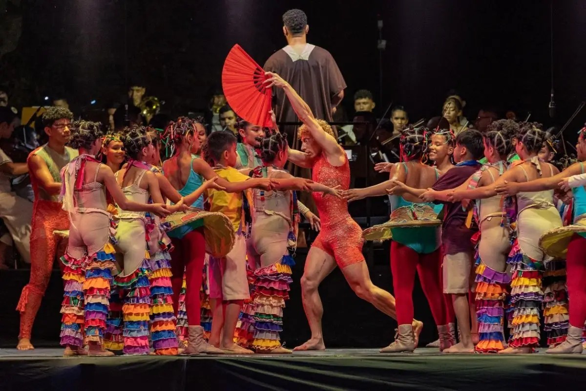 No palco, a apresentação é um verdadeiro mosaico de música, dança e imagens, criando uma narrativa que entrelaça memória, espiritualidade e pertencimento. Um dos elementos lúdicos do espetáculo é o jogo de amarelinha, que simboliza os desafios da vida e a busca por um “céu” tanto individual quanto coletivo.